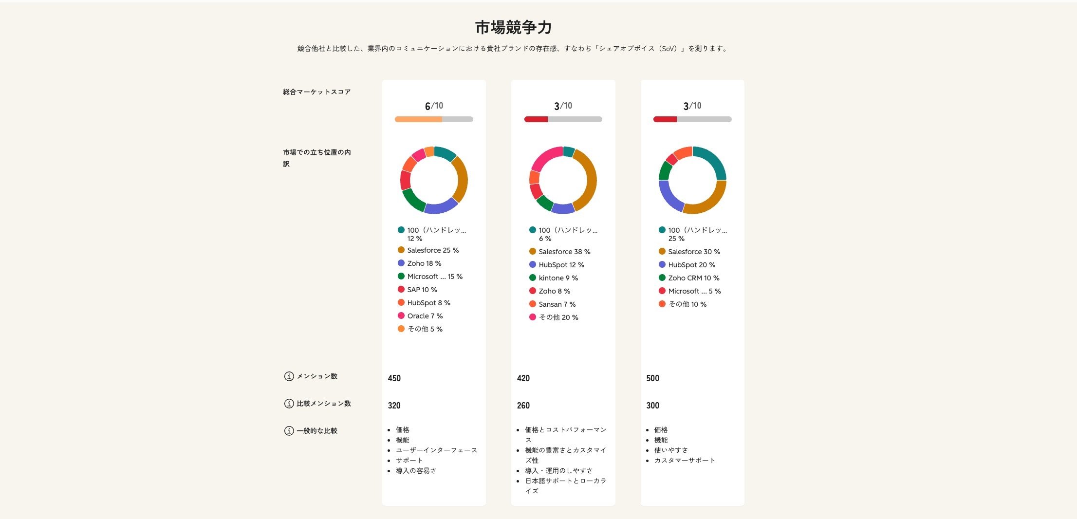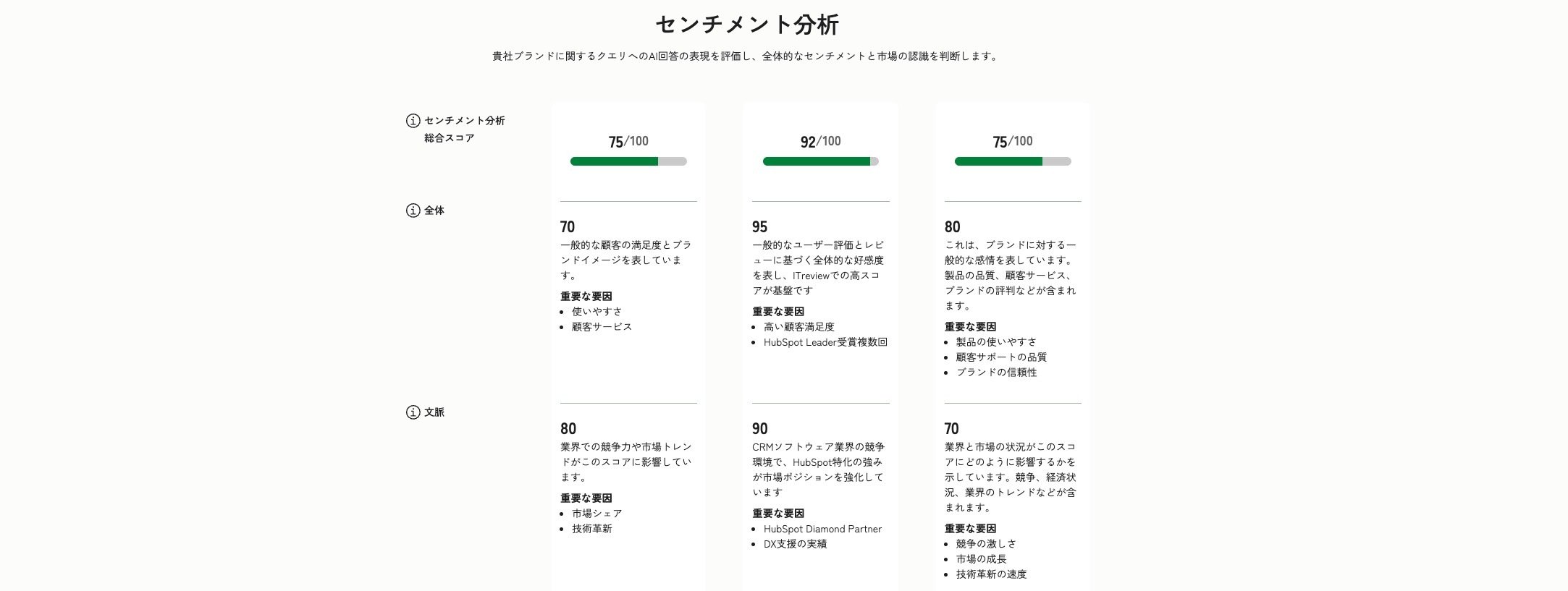 認識頻度、市場での競争上の地位、感情、および情報源の信頼性など、複数の要因を組み合わせて総合スコアを割り当てます。