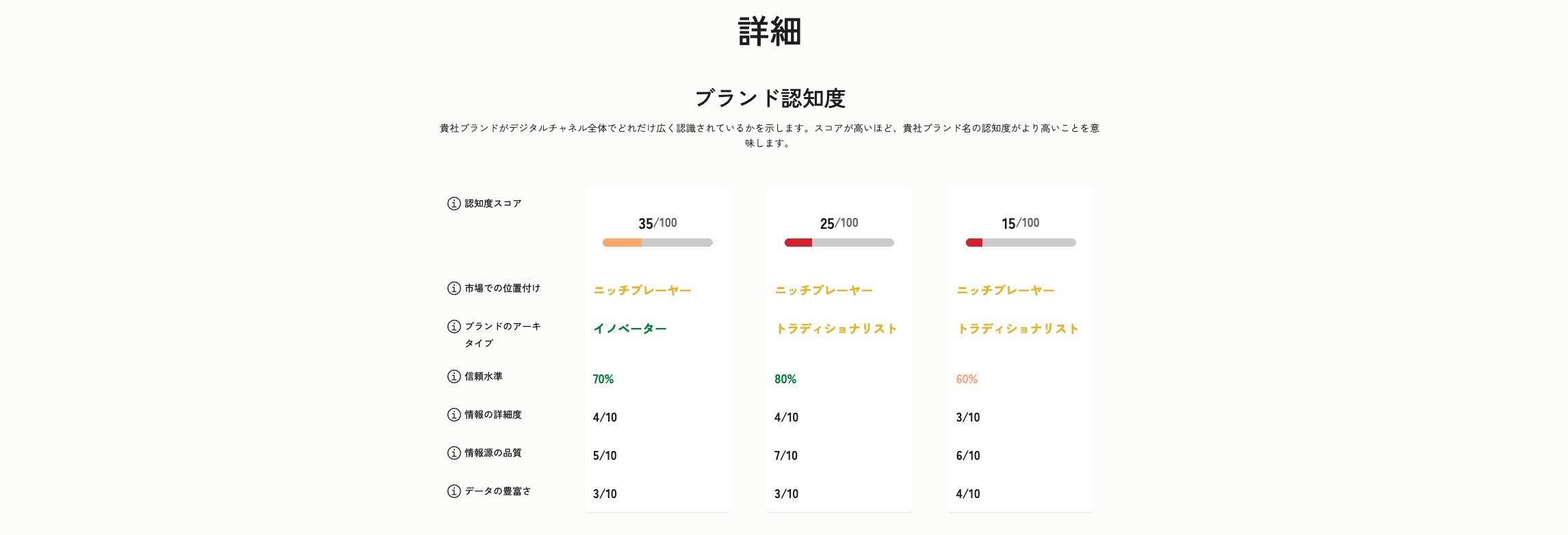 競合他社と比較して、ブランドがどの立ち位置として認識されているか。 |