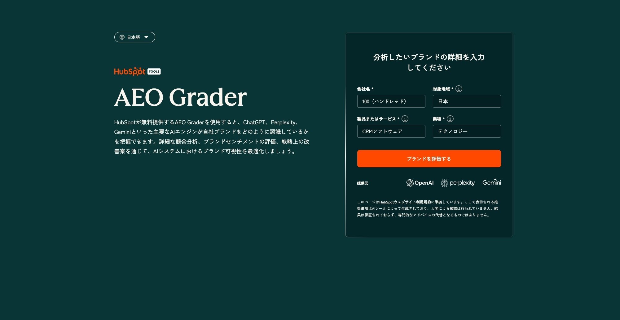 HubSpot AEO Graderは、主要なAIプラットフォームがあなたのブランドをどのように解釈し、顧客に提示しているかを分析する無料ツールです。