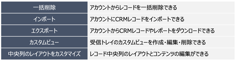 CRMには個人情報や機密情報が蓄積されているため、データのインポート・エクスポート・削除権限は厳重に管理する必要があります。